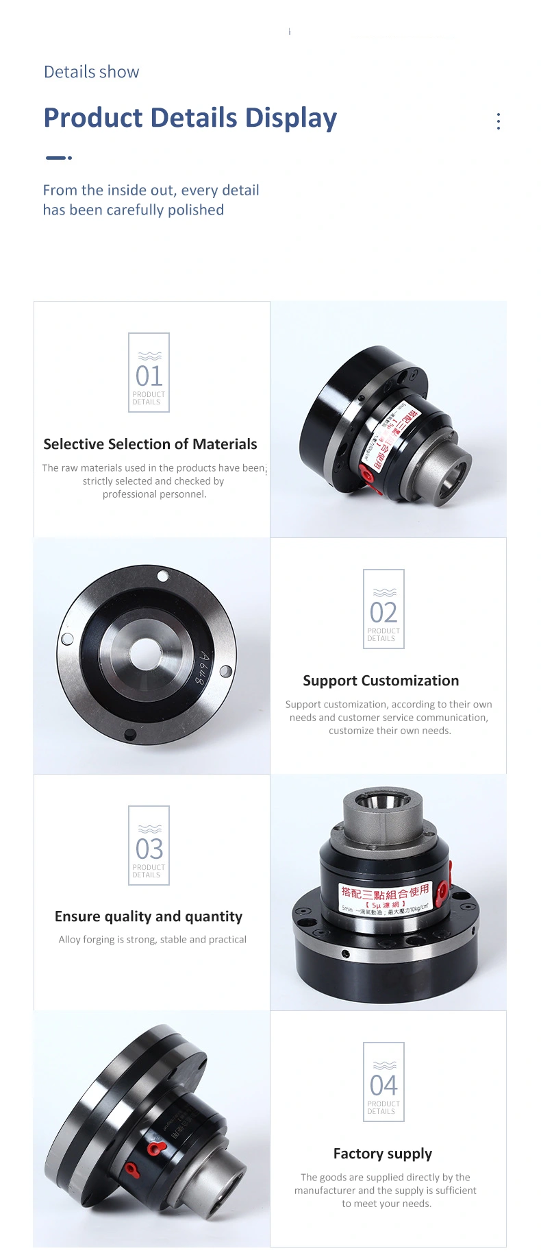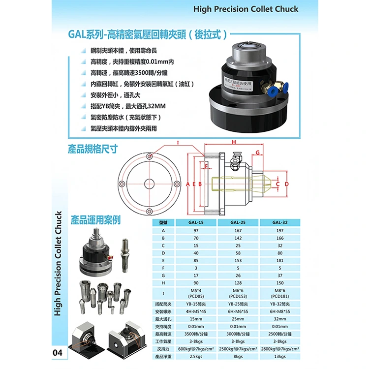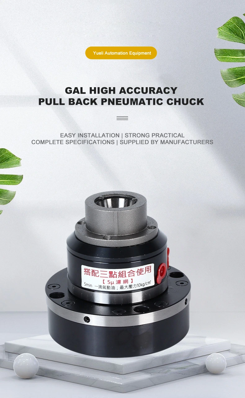 Gal-25 သည်မြန်နှုန်းမြင့်လှိမ့်သောအဆုတ်ရောင် chuck ဖြစ်သည်။ ၎င်းသည် pneumatic Chuck တစ်ခုနှင့်သက်ဆိုင်သည်။ မကြာခဏ cnc စက်, တိကျမှန်ကန်သောစက်ပစ္စည်းနှင့်အခြားတိကျသောစက်ကိရိယာများတွင်အသုံးပြုလေ့ရှိပြီး clamping တိကျမှန်ကန်မှုနှင့်အတူတည်ငြိမ်သောညှပ်ခြင်း,
